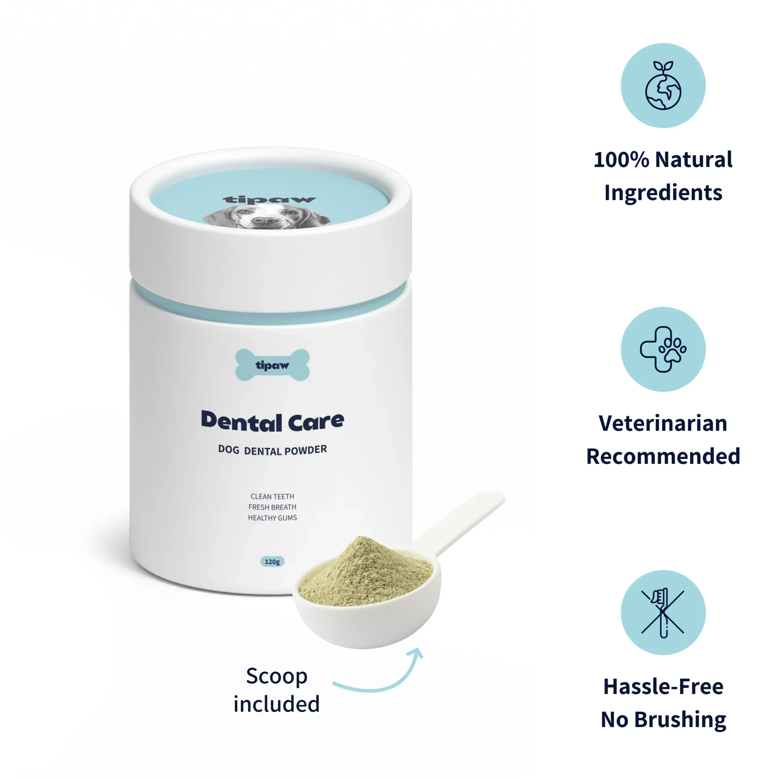 Tipaw Dental Care er et dagligt kosttilskud i pulverform, som gør det nemt at holde din hunds tænder rene og ånde frisk. Pulveret drysses blot over foderet og arbejder indefra for at reducere plak, tandsten og dårlig ånde.