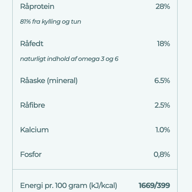 Vitamin A = 24.000 IU/kg, Vitamin D = 2.000 IU/kg, Vitamin E = 600 mg/kg, Jernsulfat monohydrat = 90 mg/kg, Koppersulfat pentahydrat = 13 mg/kg, Zinksulfat monohydrat = 100 mg/kg, Manganoxid = 40 mg/kg, Calciumjodat = 1,5 mg/kg, Natriumselenit = 0,2 mg/kg, Taurin = 1500 mg/kg, Glukosamin = 900 mg/kg, Chondroitinsulfat = 450 mg/kg