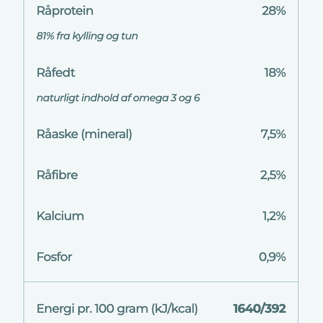 Vitamin A = 24.000 IU/kg, Vitamin D = 2.000 IU/kg, Vitamin E = 600 mg/kg, Jernsulfat monohydrat = 90 mg/kg, Koppersulfat pentahydrat = 13 mg/kg, Zinksulfat monohydrat = 100 mg/kg, Manganoxid = 40 mg/kg, Calciumjodat = 1,5 mg/kg, Natriumselenit = 0,2 mg/kg, Taurin = 1500 mg/kg, Glukosamin = 900 mg/kg, Chondroitinsulfat = 450 mg/kg